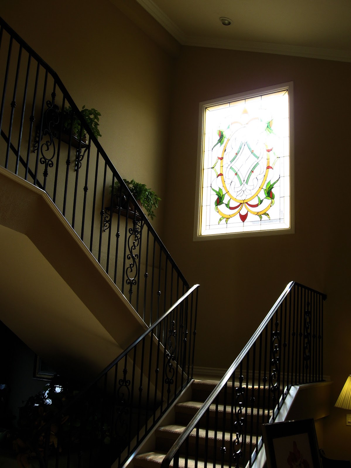 Visible from the entry is the staircase - in all its 70's see-through style. On the landing, a faux stained glass window had seen better days and was deteriorating. The metal and oak railings begged for an update.